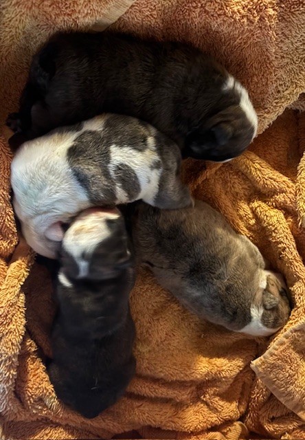 Dempsey and CH Exact Classic Real Stihl had 4 beautiful girls born on 10/6/2025. Frenchie puppies were born 8/1/2025 and are ready to go to their new homes. Please check back for updates.